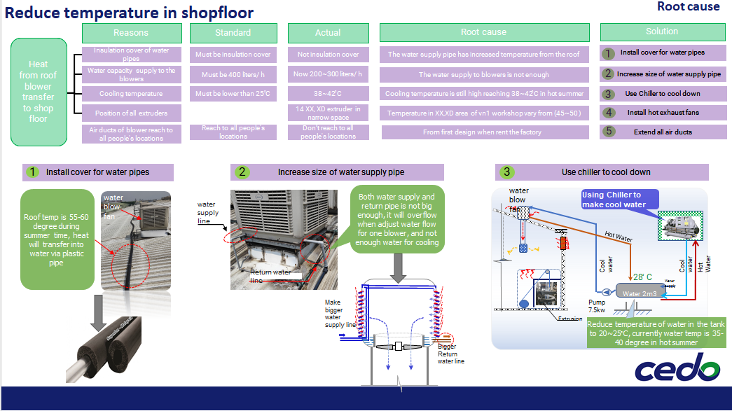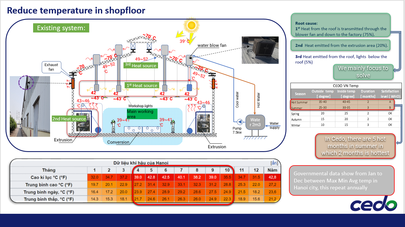 – Nhiệt độ Khu vực làm việc ở 5 tháng mùa hè và đặc biệt 2 tháng nóng nhất là 40-45 độ C. Còn nhiệt độ mùa hè trung bình từ 30-35 độ C cao hơn môi trường 5-10 độ C.- Nhiệt độ water blow fan vào xưởng 42-43 độ C.