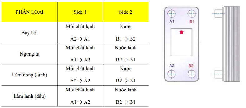 - Đối với quá trình bay hơi thì đường ống của môi chất lạnh phải được đặt ở phía bên trái lối vào phía dưới và ra ở phía trên.